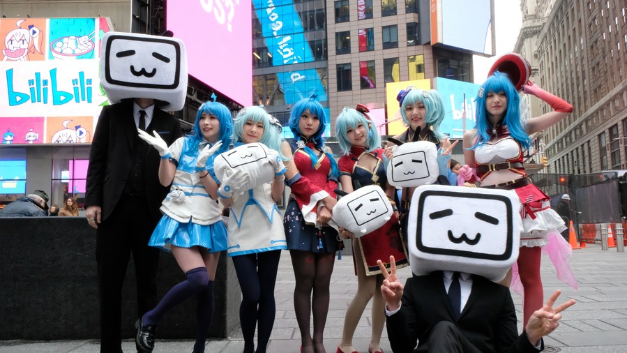 Cosers from Bilibili, a Chinese online platform for animated video, pose for photos at Times Square in New York, the United States, on March 28, 2018. (Xinhua/Li Ming)