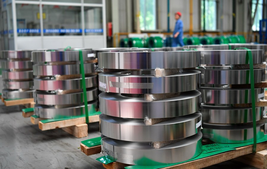 Photo taken on May 24, 2019 shows ultra-thin stainless steel strips made by Taiyuan Iron and Steel (Group), or TISCO, in Taiyuan, north China's Shanxi Province, May 24, 2019. The company possesses over 2,700 authorized patents, including 772 patents for invention. (Xinhua/Cao Yang)