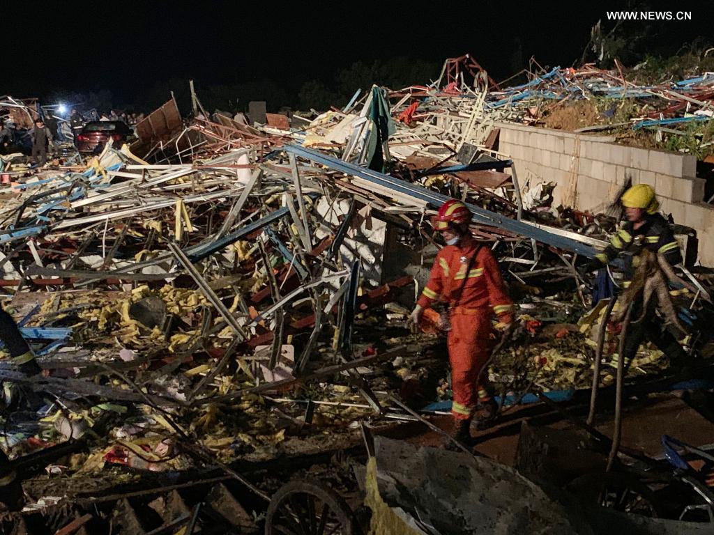Photo taken with a mobile phone on May 15, 2021 shows rescue team members walk past the rubble of collapsed buildings after a tornado in Caidian District of Wuhan, central China's Hubei Province. Six people have been confirmed dead, and 218 others injured after a tornado on Friday night walloped Wuhan in central China's Hubei Province, government sources said. The tornado, packing winds of 23.9 meters per second, ripped through the Caidian District at 8:39 p.m. Friday, toppling some construction site sheds and snapping a large number of trees. (Xinhua/Xiong Qi)
