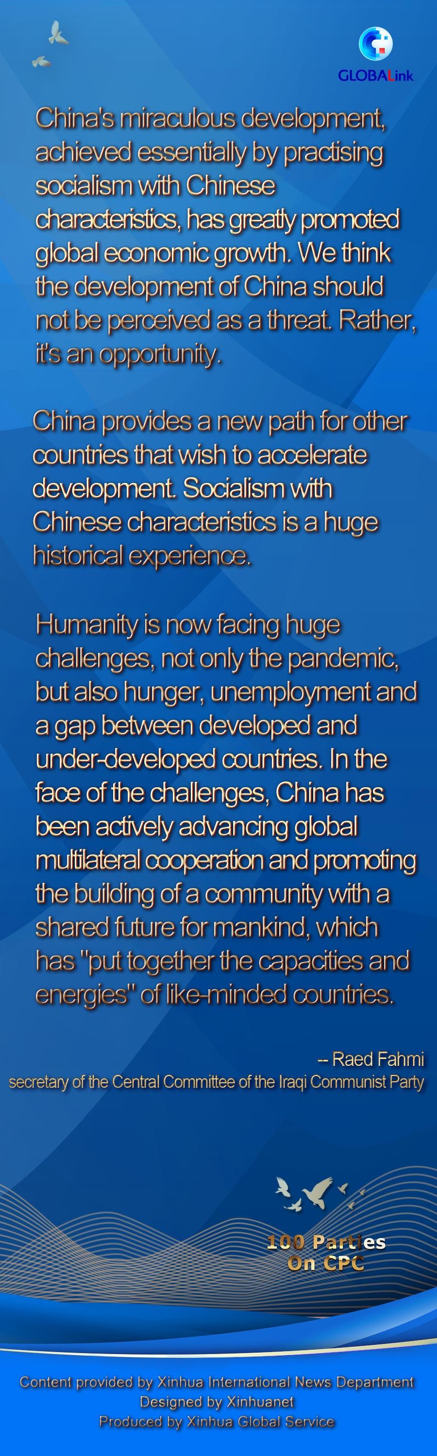 "They start to see it as a challenge, as a threat which it shouldn't be... We think the development of China should not be perceived as a threat. Rather, it's an opportunity," said Raed Fahmi, secretary of the Central Committee of the Iraqi Communist Party, rejecting the depiction of China by some Western media outlets.