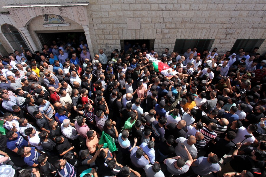 Mourners carry the body of Palestinian Tareq Snobar, 24, who was killed during clashes with Israeli soldiers, during his funeral in Yetma village, east of the West Bank city of Nablus, May 16, 2021. (Photo by Nidal Eshtayeh/Xinhua)