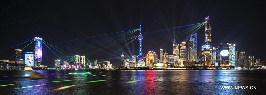 Photo taken on Nov. 4, 2020 shows a light show at the Lujiazui area in Shanghai, east China. A light show themed on the China International Import Expo (CIIE) was held in Lujiazui on Wednesday. (Xinhua/Zhang Haofu)
