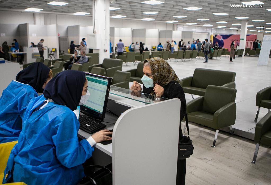 A woman registers to receive the COVID-19 vaccine at a vaccination site in Tehran, Iran, on May 17, 2021. Iran reported on Monday 14,319 new COVID-19 cases, raising the country's total number to 2,765,485. By Monday, 2,032,162 people have received the first doses of coronavirus vaccines and 388,821 the second doses. (Photo by Ahmad Halabisaz/Xinhua)
