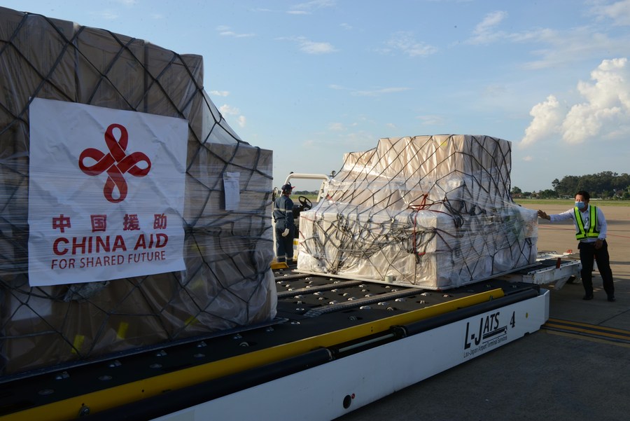 Workers transport anti-epidemic material supplies donated by the Chinese government at Wattay International Airport in Vientiane, Laos, May 10, 2021. (Xinhua/Zhang Jianhua)