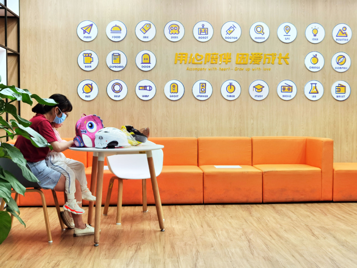 A mother and child wait in the lobby of a tutoring center in Nanjing. [Photo/CHINA DAILY]