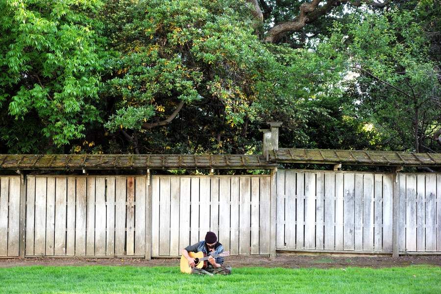 A man wearing a mask plays guitar at a park in San Mateo, California, the United States, May 17, 2021.(Xinhua/Wu Xiaoling)