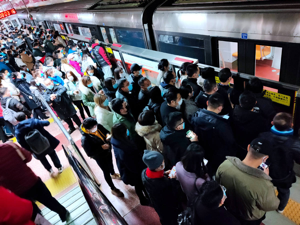 Commuters line up to board a subway train during the morning rush hour at Sihuidong station in Beijing in November. [Photo by Zhu Zhenqiang/For China Daily]