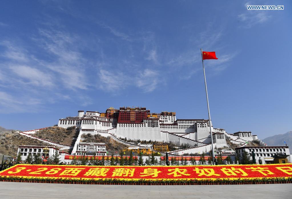 The square in front of the Potala Palace is decorated to celebrate the Serfs' Emancipation Day in Lhasa, capital of southwest China's Tibet Autonomous Region, March 28, 2021. (Xinhua/Jigme Dorge)