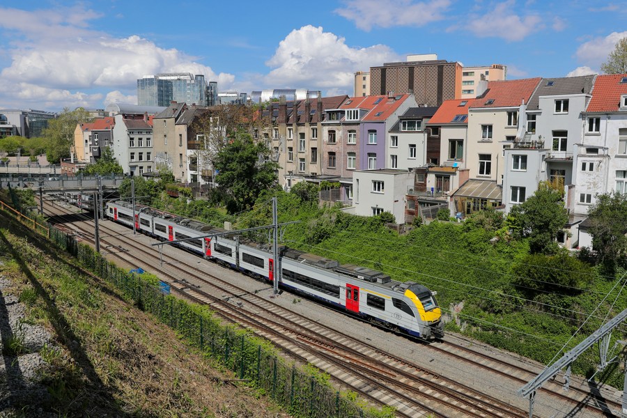 A train runs through a residential area in Brussels, Belgium, May 18, 2021. (Xinhua/Zheng Huansong)