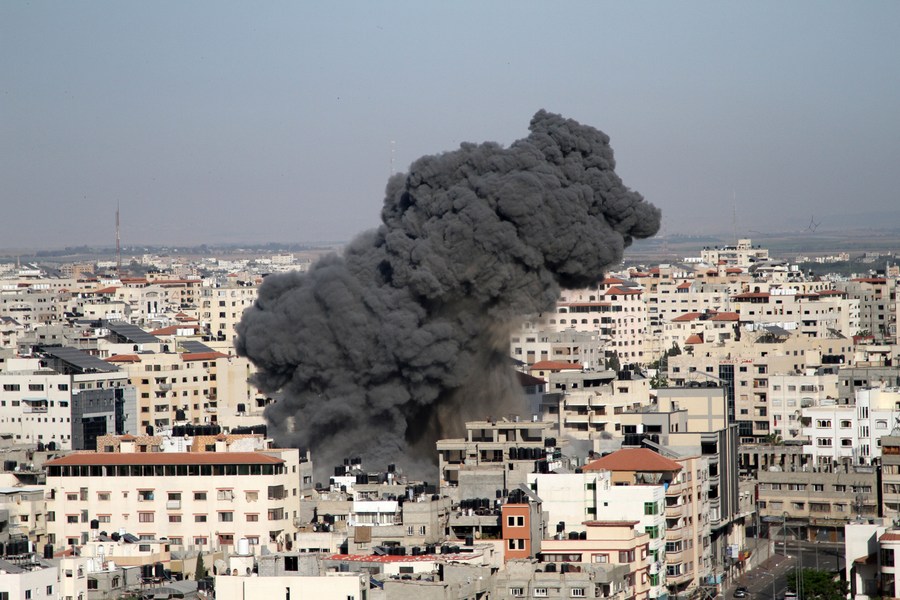 Photo taken on May 14, 2021 shows explosions following Israeli air strikes on a bank that belongs to Hamas in Gaza City. (Photo by Rizek Abdeljawad/Xinhua)