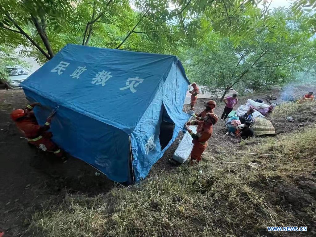 Rescuers set up a tent in Yangbi Yi Autonomous County, southwest China's Yunnan Province, May 22, 2021. At least 3 people were killed and 27 others injured as of 6 a.m. Saturday after a series of earthquakes jolted Yangbi Yi Autonomous County in Dali Bai Autonomous Prefecture, southwest China's Yunnan Province, local authorities said. Four earthquakes over 5.0-magnitude jolted Yangbi from 9 p.m. to 11 p.m. (Beijing Time), according to the China Earthquake Networks Center. Rescue forces have been dispatched to the quake zone, and rescue efforts are underway. (Xinhua)