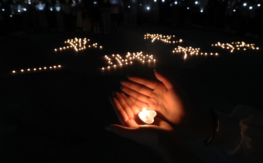 Students light candles to mourn the passing away of Yuan Longping at University of South China in Hengyang, central China's Hunan Province, May 22, 2021. (Photo by Cao Zhengping/Xinhua)