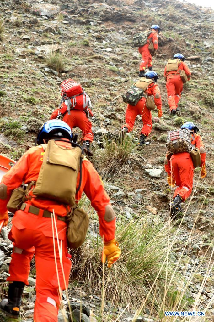 Rescuers search for victims in Jingtai County of Baiyin City, northwest China's Gansu Province, May 23, 2021. Lasting almost 24 hours, rescue work came to an end after extreme weather killed 21 during a 100-km cross-country mountain marathon race in Baiyin City, northwest China's Gansu Province, the local rescue headquarters said on Sunday. (Fire and Rescue Department of Gansu/Handout via Xinhua)