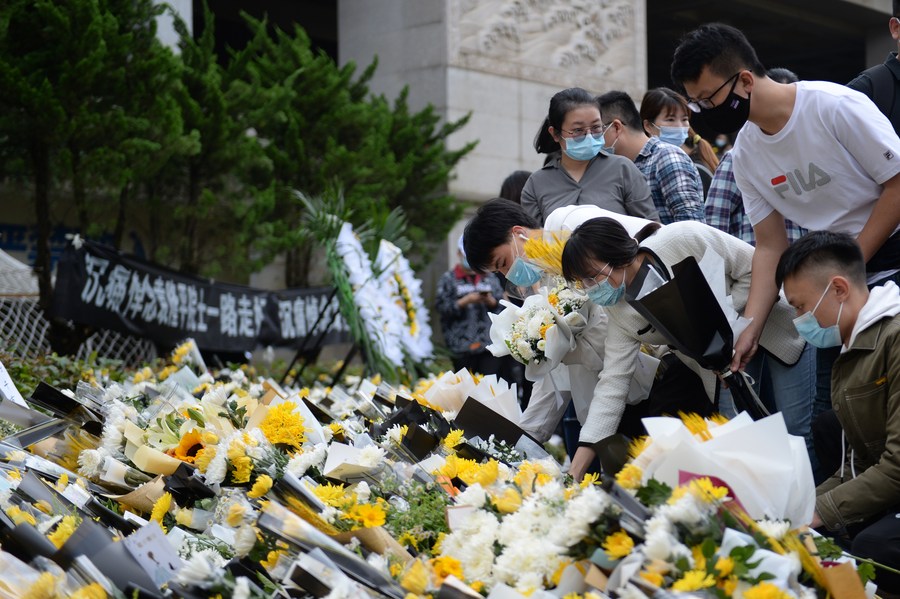 Despite being a busy workday, thousands of people dressed in black showed up and laid flowers at the site before the service began at 10 a.m. in Changsha, capital of central China's Hunan Province.