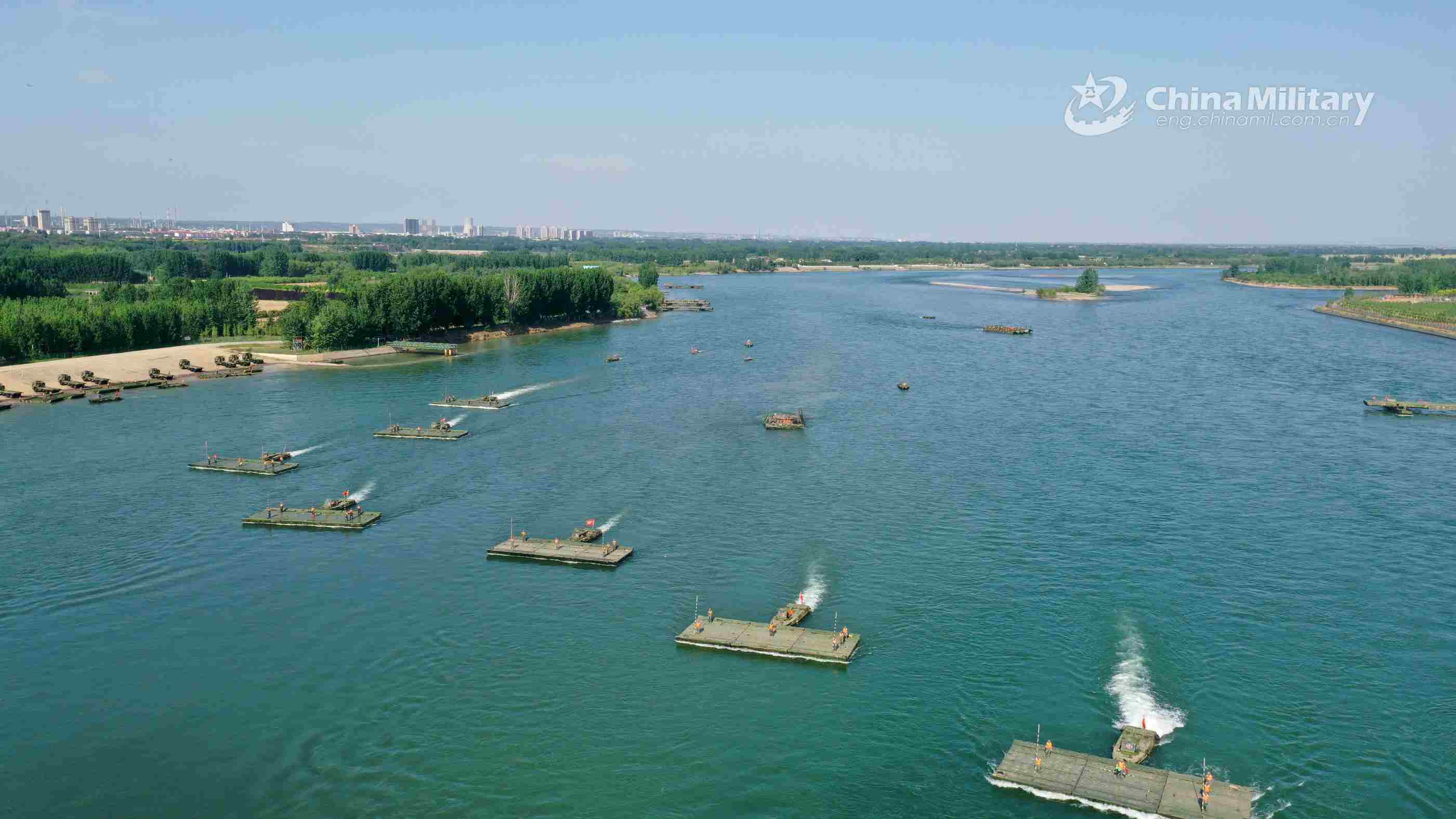 Propulsion boats attached to the pontoon element of a brigade under the PLA 83th Group Army rush to the designated area during a field support drill on May 20, 2021. (eng.chinamil.com.cn/Photo by Jia Fangwen)