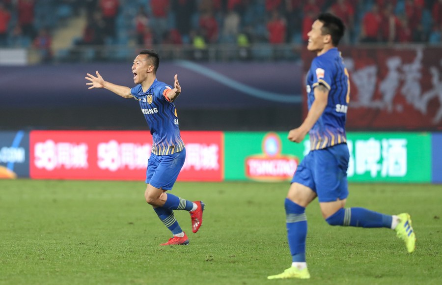 Wu Xi (L) of Jiangsu Suning celebrates for victory after the 18th round match between Jiangsu Suning and Shanghai SIPG at 2020 season Chinese Football Association Super League (CSL) Suzhou Division in Suzhou, east China's Jiangsu Province, Nov. 2, 2020. (Xinhua/Yang Lei)