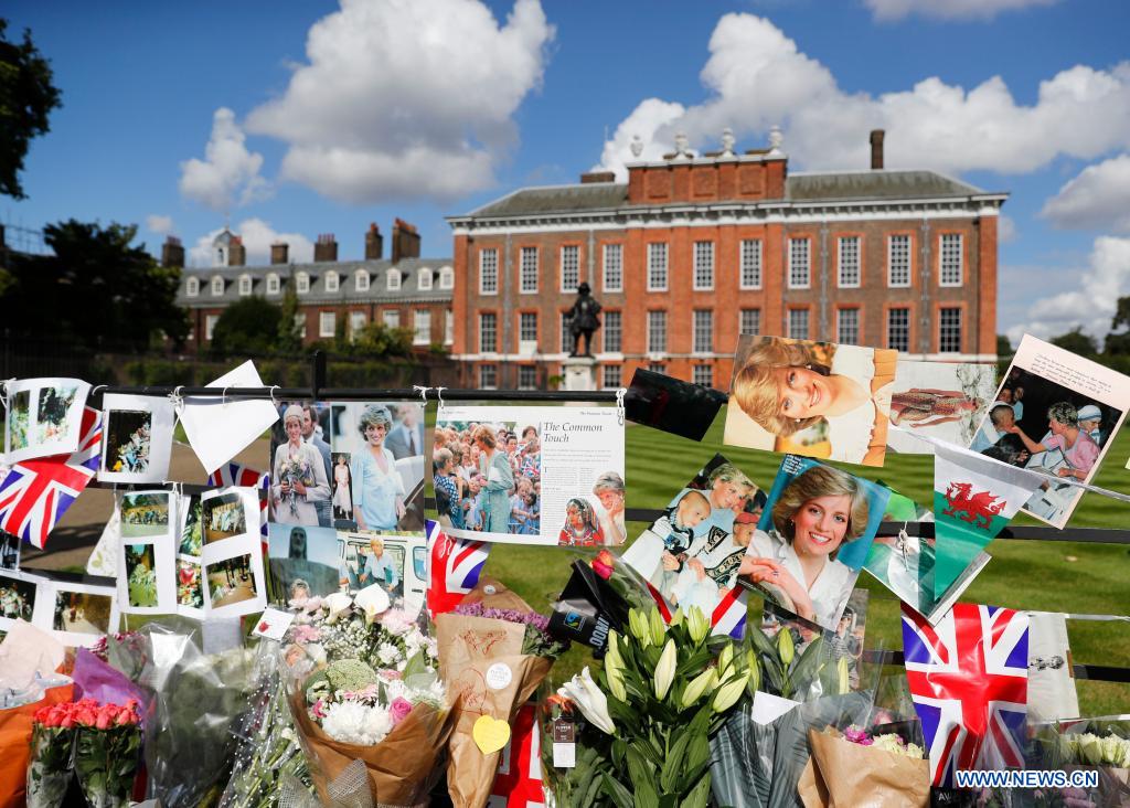 File photo taken on Aug. 31, 2017 shows tributes in honor of late Princess Diana outside the Kensington Palace on the 20th anniversary of her death in Paris after a car crash, in London, Britain. The BBC Board on May 24, 2021 announced a review of the corporation's editorial and whistle-blowing policies amid mounting pressure following an inquiry into BBC's 1995 interview with Princess Diana. The BBC said it accepted the inquiry report, which said the BBC fell short of "high standards of integrity and transparency" over its interview with Princess Diana. (Xinhua/Han Yan)