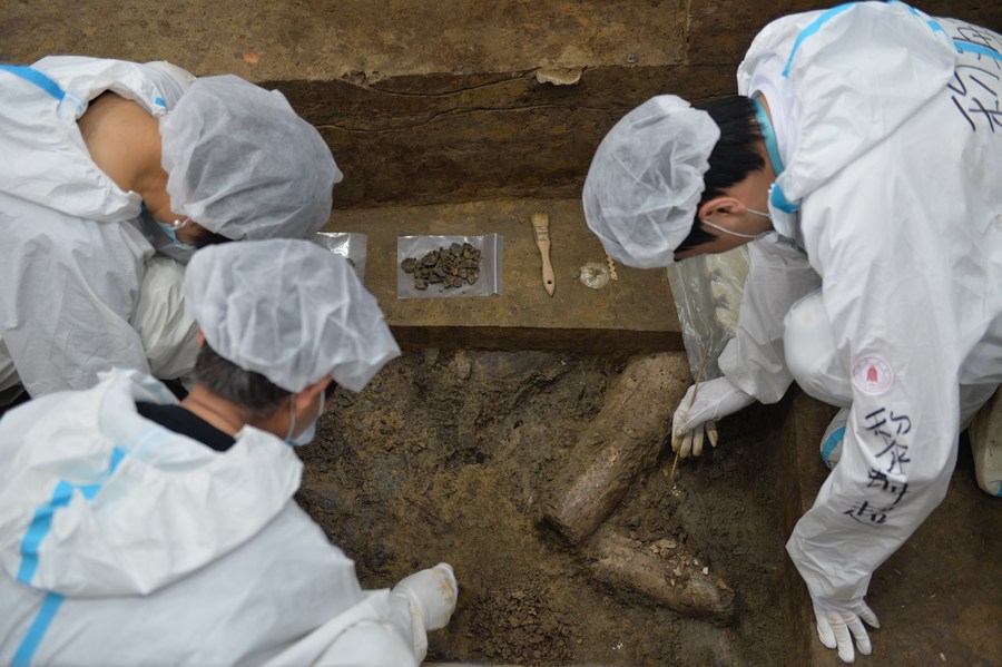 Photo taken on May 26, 2021 shows archeologists cleaning up ivory relics found in the No.7 sacrificial pit at Sanxingdui Ruins site in Guanghan, southwest China's Sichuan Province. (Xinhua/Liu Mengqi)
