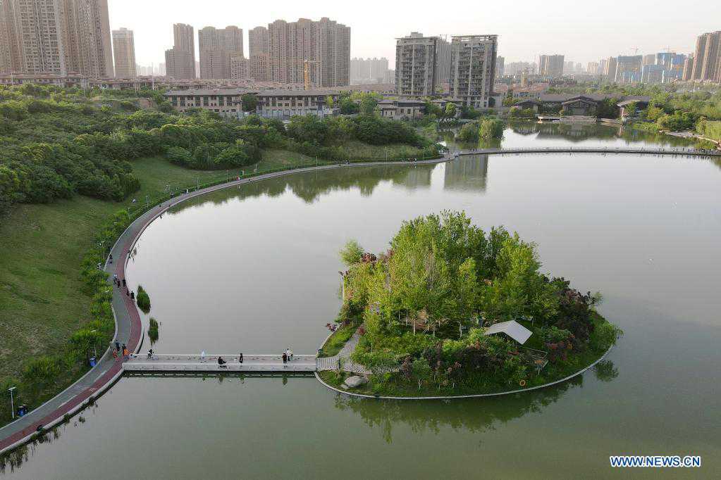 Aerial photo taken on May 28, 2021 shows the view of a city park along Chanhe River in Xi'an, northwest China's Shaanxi Province. (Xinhua/Shao Rui)