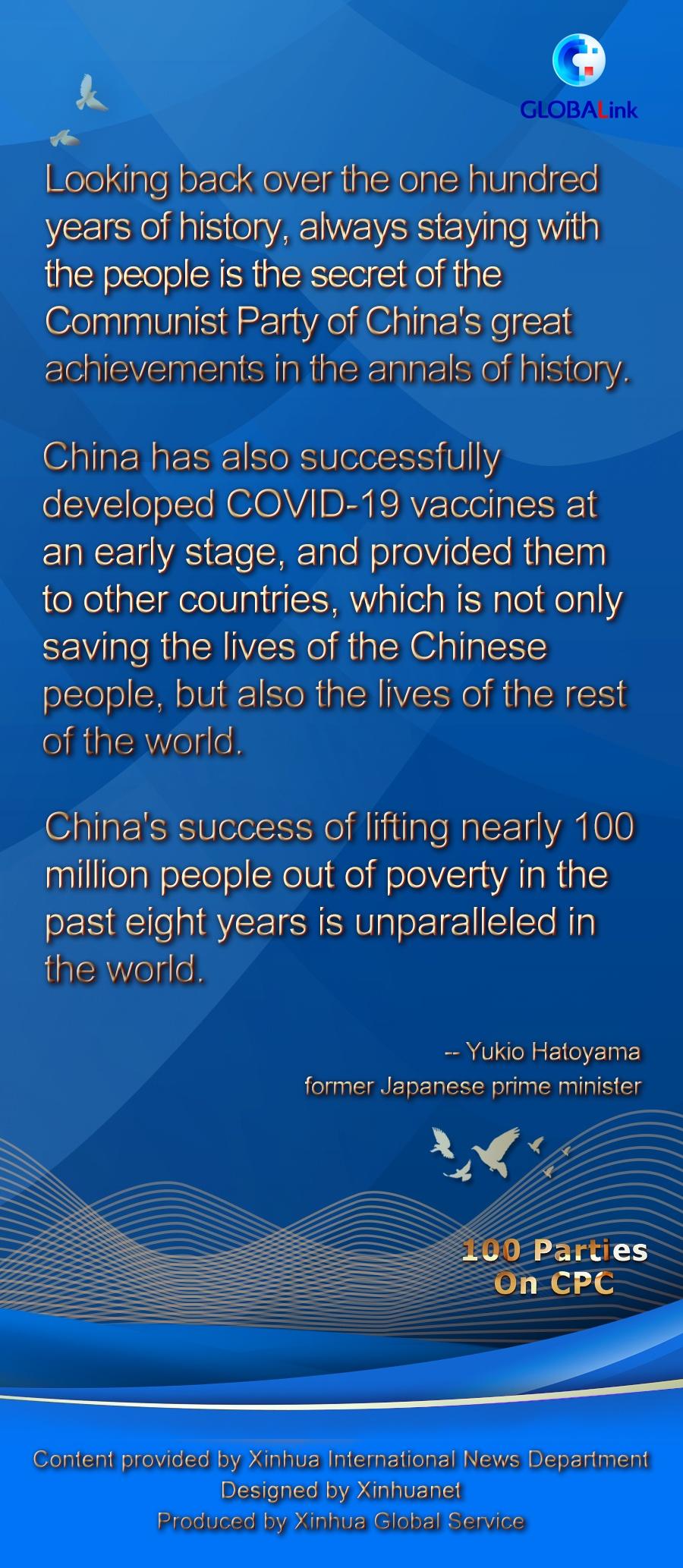 "Looking back over the one hundred years of history, always staying with the people is the secret of the Communist Party of China's great achievements in the annals of history," Hatoyama told Xinhua in a recent written interview.