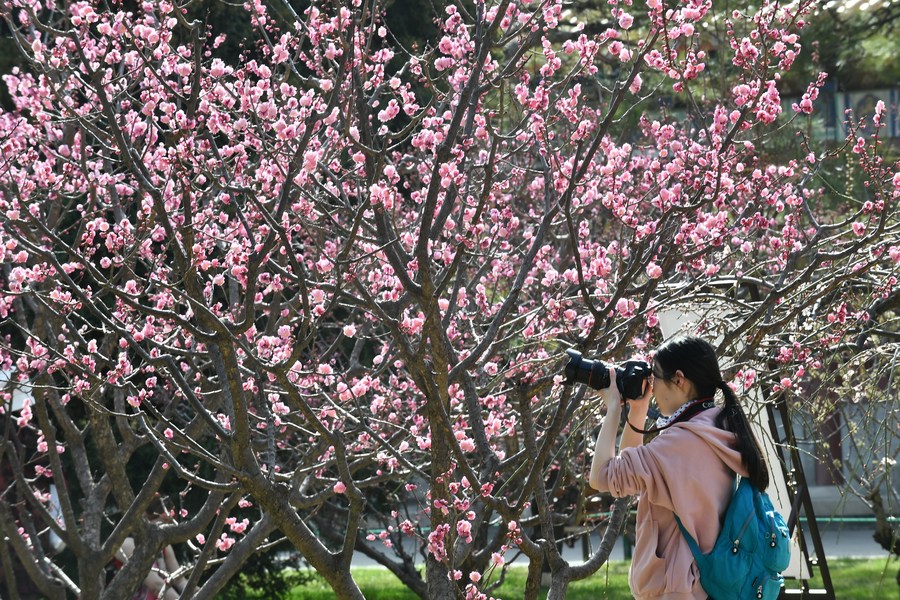A tourist takes pictures of flowers at Zhongshan Park in Beijing, capital of China, March 24, 2021.(Xinhua/Luo Xiaoguang)