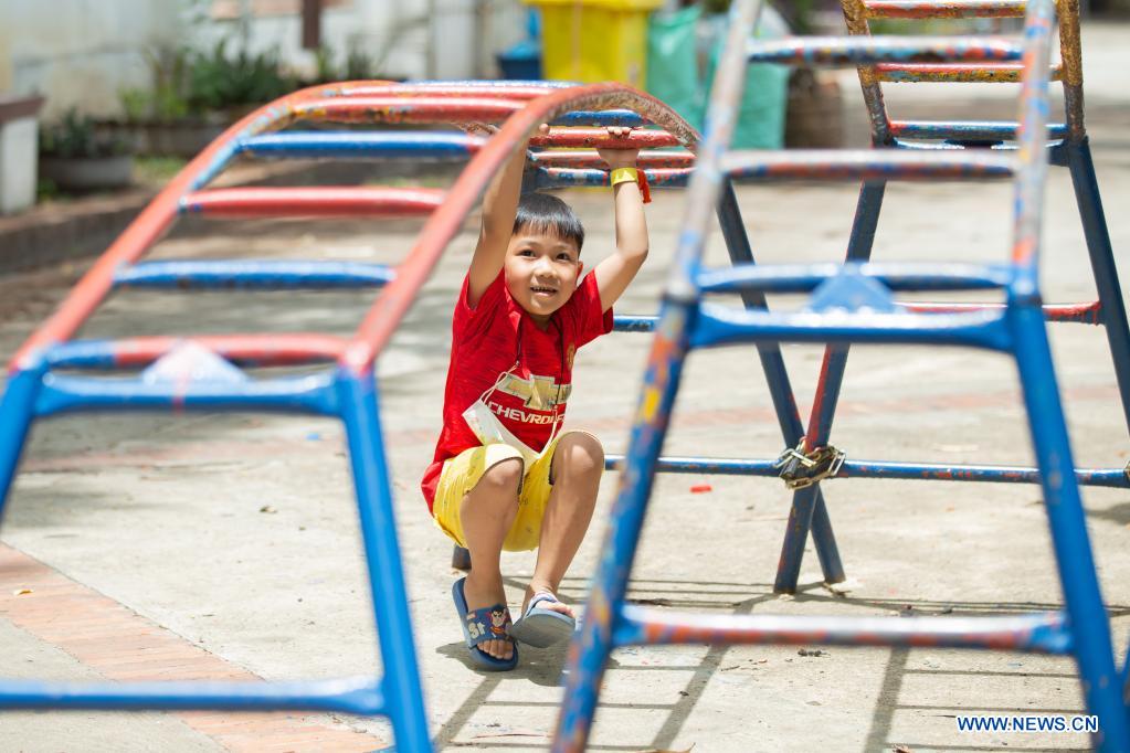 A kid plays in a closed kindergarten during a lockdown in the ancient town of Luang Prabang, Laos, June 1, 2021. The northern Laos' hub Luang Prabang is under lockdown to curb the outbreak of COVID-19 epidemic. (Photo by Kaikeo Saiyasane/Xinhua)