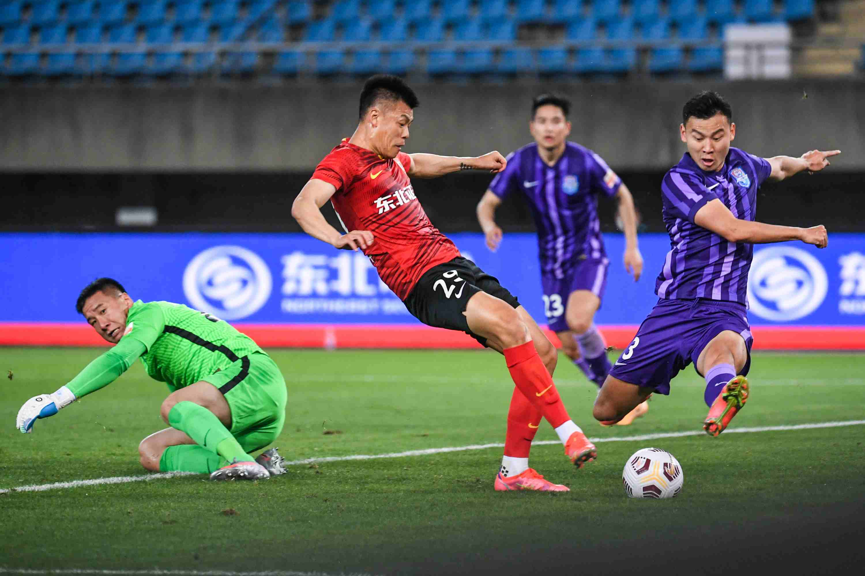 Tan Long (2nd L) of Changchun Yatai FC shoots during the 2nd round match between Changchun Yatai FC and Tianjin Jinmen Tiger FC at the 2021 season Chinese Football Association Super League (CSL) Suzhou Division in Suzhou, east China's Jiangsu Province, April 29, 2021. (Xinhua/Li Bo)