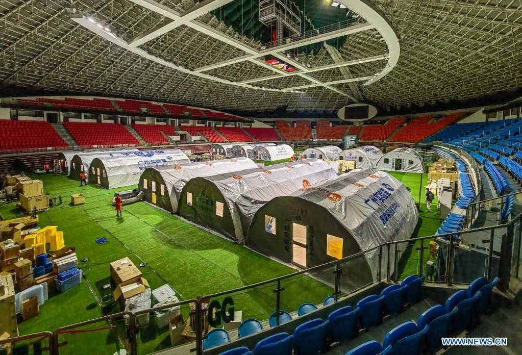 Builders set up temporary laboratories for nucleic acid testing in a stadium in Guangzhou, capital of south China's Guangdong Province, June 1, 2021. Four nucleic acid testing laboratories, with each unit covering an area of 210 square meters, were erected in early morning on June 2, and are about to put into use on June 3. The laboratories are able to test over 120,000 samples a day, which will significantly improve the city's testing capability. (Xinhua/Liu Dawei)