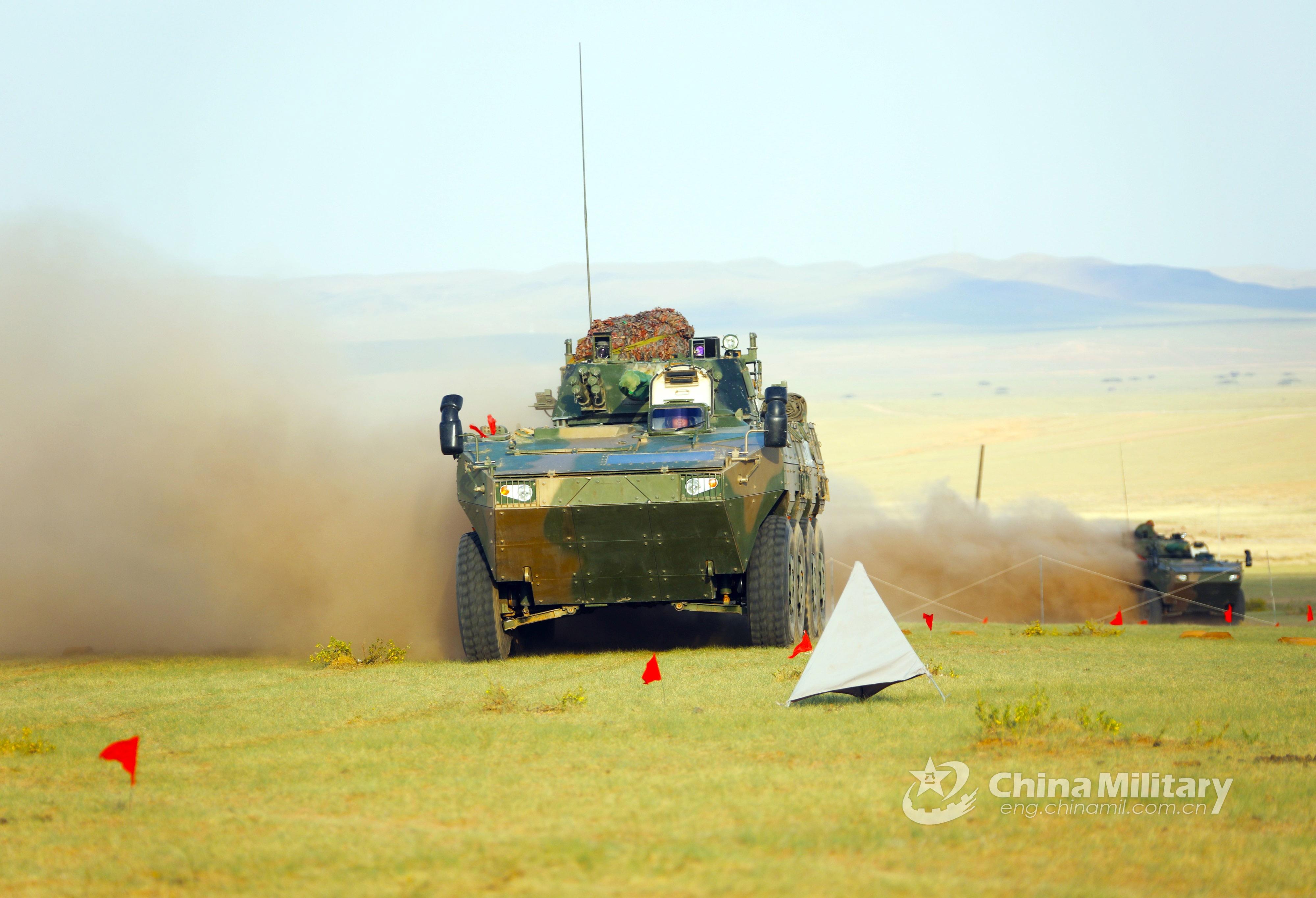 The armored vehicles attached to a combined arms brigade under the PLA 78th Group Army speed toward the designated mission area during the tactical training in early June, 2021. (eng.chinamil.com.cn/Photo by Zhang Yanjun)