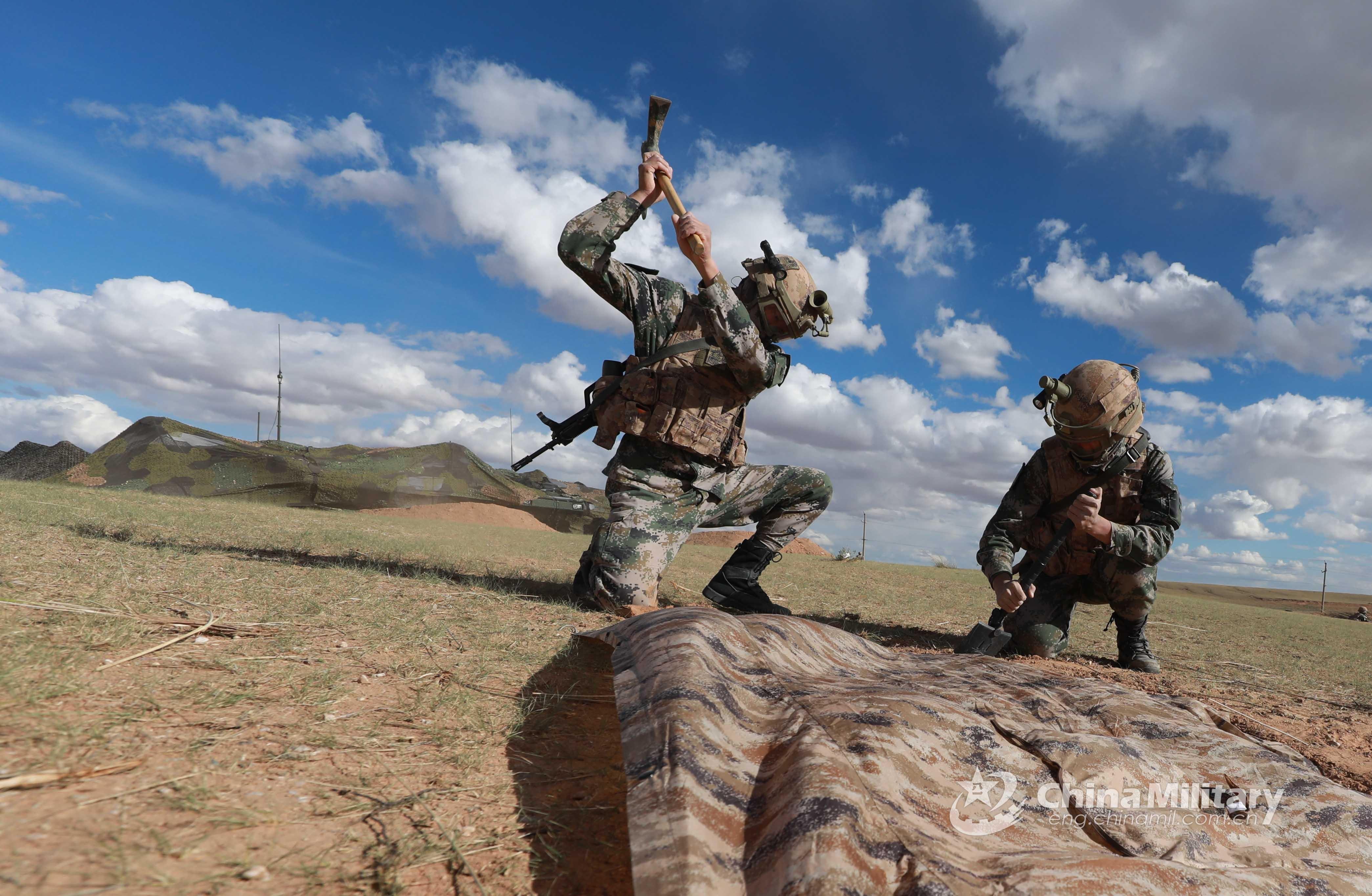 Two soldiers assigned to a combined arms brigade under the PLA 78th Group Army dig field works before the tactical training in early June, 2021. (eng.chinamil.com.cn/Photo by Zhang Yanjun)