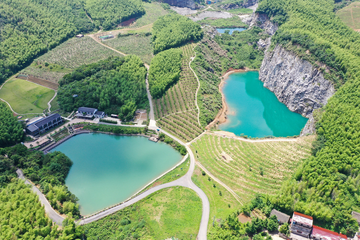 This aerial photo shows a homestay built on an abandoned mine in Daibu county, Liyang city, East China's Jiangsu province, on May 17, 2021. [Photo/Xinhua]