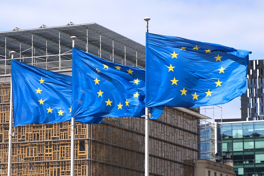 Flags of the European Union fly outside the EU headquarters in Brussels, Belgium, May 21, 2021. (Xinhua/Zheng Huansong)