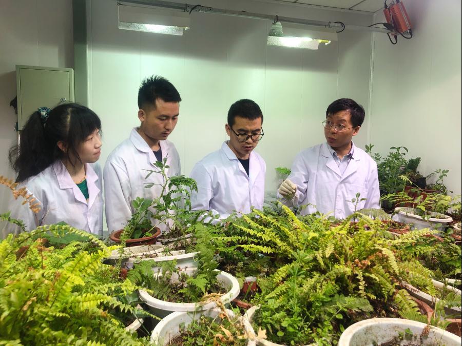Photo taken on May 26, 2021 shows Fang Xiangwen, leader of the research team at the State Key Laboratory of Grassland Agro-Ecosystems of Lanzhou University, explaining to researchers the growth of Caragana plants. (Xinhua/Zhang Wenjing)