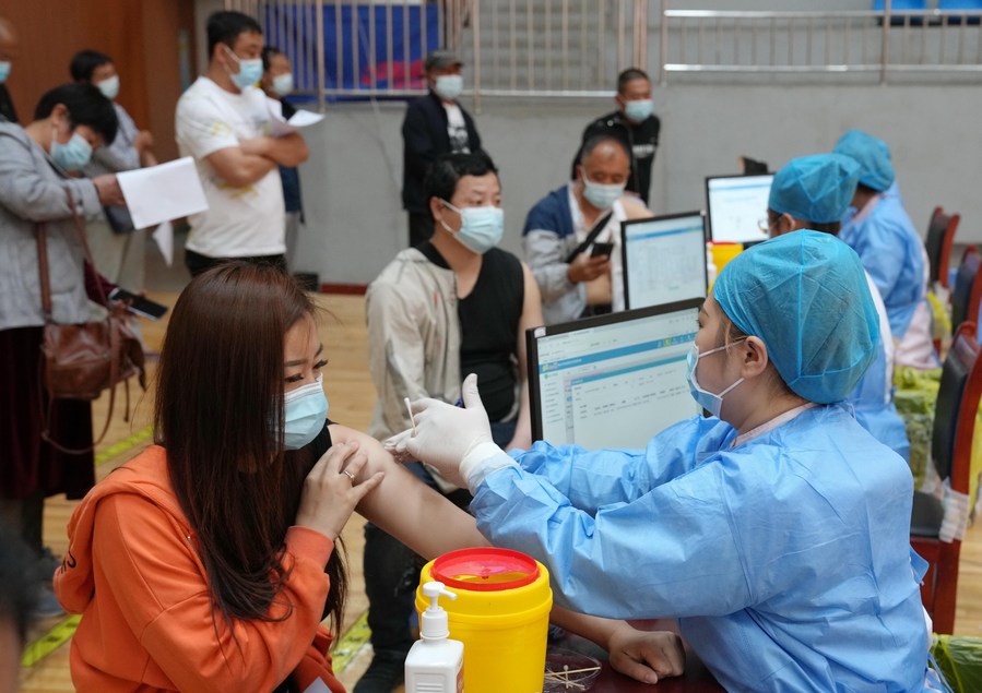 Medical workers administer COVID-19 vaccine doses to residents at a vaccination site in Tangshan, north China's Hebei Province, May 28, 2021. (Xinhua/Yang Shiyao)