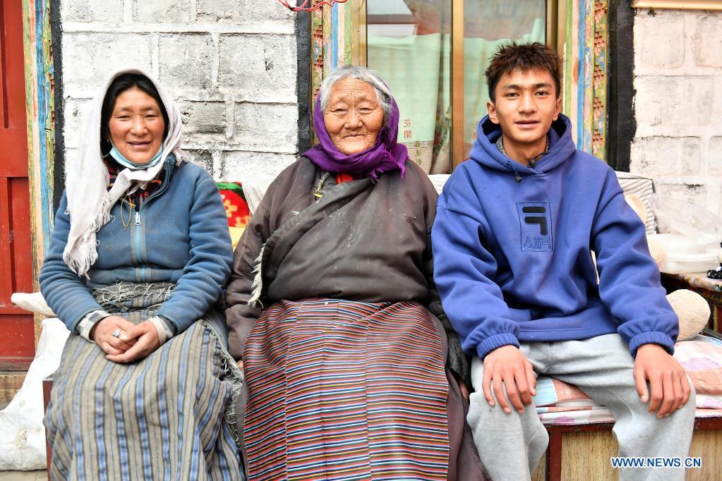 Sercho (C) and her family pose for a group photo in Nalung Village of Damxung County, southwest China's Tibet Autonomous Region, April 15, 2021. Sercho, born in 1929, was a serf and lived under cruel feudal serfdom before the democratic reform in Tibet in 1959. Born at the cowshed, Sercho could never forget the difficult times without enough clothes and food in old Tibet. "When I was a child, I was physically weak. My father took me to beg from door to door," Sercho recalled. Thanks to the democratic reform, Sercho's life turned on a new page and she enjoys her life now. (Xinhua/Sun Ruibo)