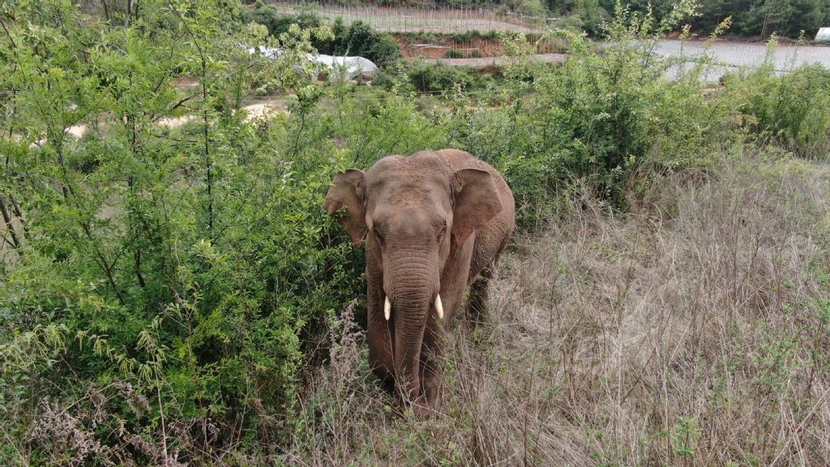 This aerial photo shows a male elephant, which broke free from the herd on June 6, traveling alone. [Photo provided by Yunnan Provincial Forest Fire Brigade]