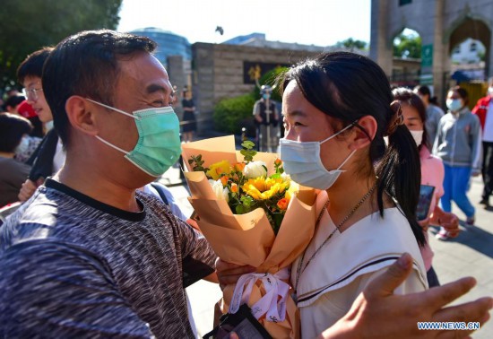 An examinee hugs her father outside an exam site at a middle school in Beijing, capital of China, June 10, 2021. The annual college entrance exam concluded Thursday in Beijing. (Xinhua/Peng Ziyang)