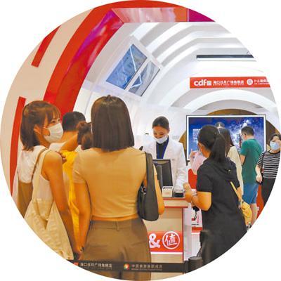 Photo shows tourists looking at goods at a cosmetics counter at a duty-free shop in Hainan. (People's Daily/Wang Xinyue)