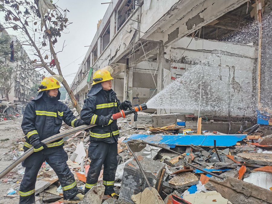 Rescuers work at a gas explosion site in Yanhu Community of Zhangwan District in Shiyan City, central China's Hubei Province, June 13, 2021. (Xinhua/Xiao Yijiu)