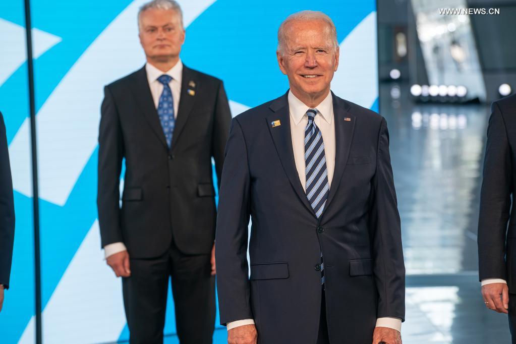 U.S. President Joe Biden (Front) poses for a group photo during a NATO summit at NATO headquarters in Brussels, Belgium, on June 14, 2021. Leaders of the North Atlantic Treaty Organization (NATO) held a face-to-face summit on Monday to show their unity and agreed on the "NATO 2030" agenda to address future challenges. (NATO/Handout via Xinhua)