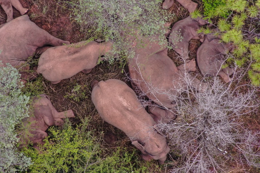 Aerial photo taken on June 11, 2021 shows a herd of wild Asian elephants in Yimen County of Yuxi City, southwest China's Yunnan Province.(Xinhua/Hu Chao)
