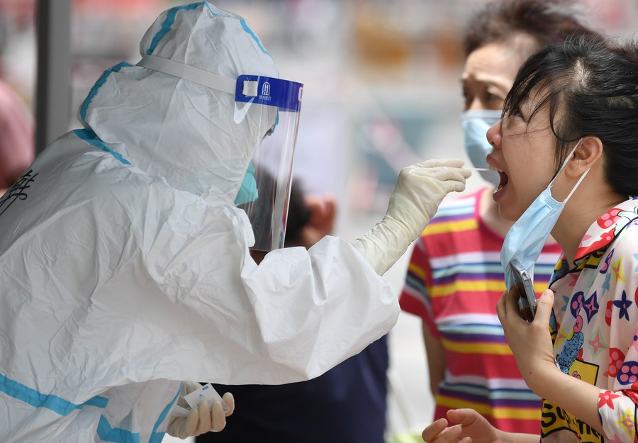 A medical worker in protective suit collects a swab sample from a woman for COVID-19 nucleic acid testing in the subdistrict of Baihedong in Liwan District of Guangzhou, south China's Guangdong Province, June 12, 2021. (Xinhua/Deng Hua)