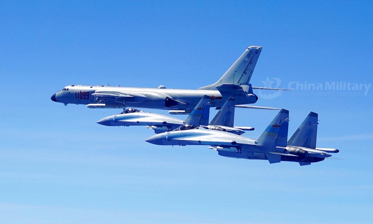 Two Su-35 fighter jets and a H-6K bomber fly in formation on May 11, 2018. The People's Liberation Army (PLA) air force conducted patrol training over China's island of Taiwan on Friday. Su-35 fighter jets flew over the Bashi Channel in formation with the H-6Ks for the first time, which marks a new breakthrough in island patrol patterns, said Shen Jinke, spokesperson for the PLA air force.Photo:China Military