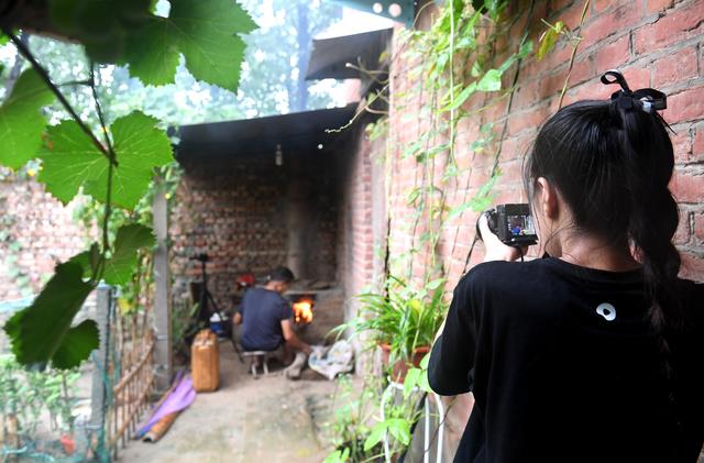 Wang Xiaonan shoots a short video at her hometown in a village in Huaxian county, central China’s Henan province. (Photo/Xinhua)