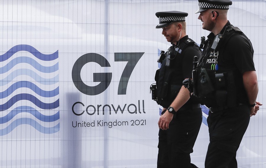 Police officers patrol outside the G7 media center in Falmouth, Cornwall, Britain, on June 11, 2021. (Xinhua/Han Yan)