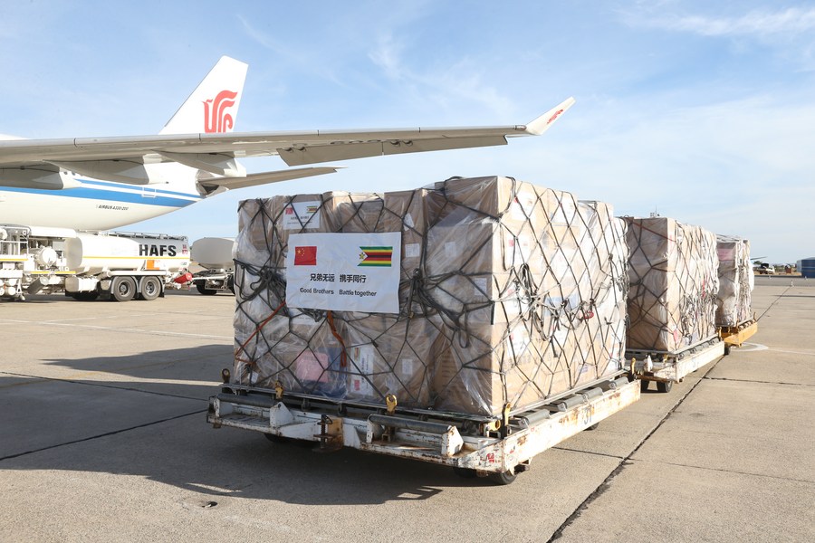 Medical supplies donated by China are unloaded from a plane at Robert Mugabe International Airport in Harare, Zimbabwe, on May 11, 2020. (Xinhua/Zhang Yuliang)
