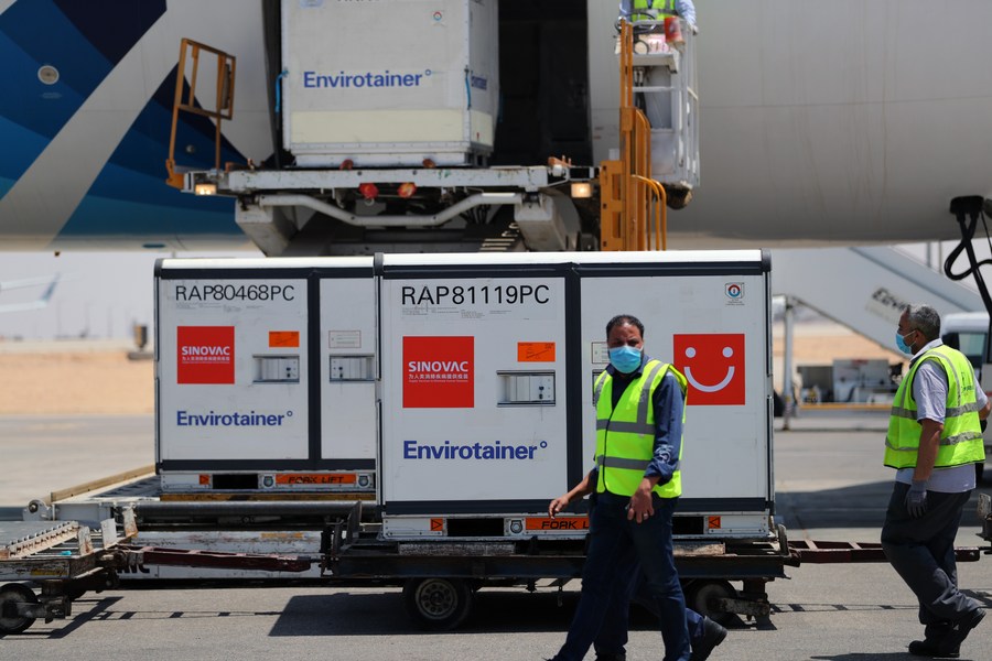 Airport staff members transport the first batch of Chinese Sinovac vaccine raw materials unloaded from a plane at the Cairo International Airport in Cairo, Egypt, May 21, 2021. (Xinhua/Sui Xiankai)