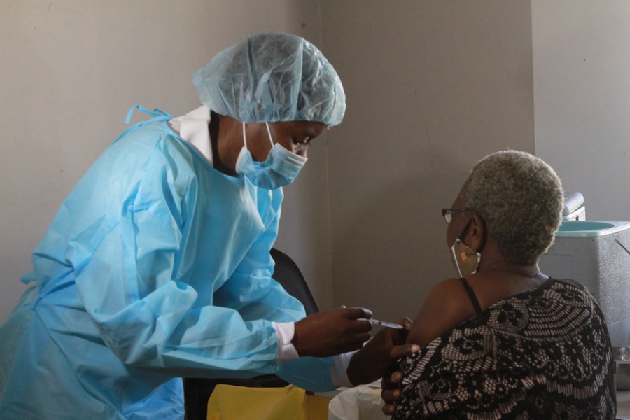 A woman receives her first jab of Sinovac COVID-19 vaccine at Mbare Polyclinic in Harare, capital of Zimbabwe, April 14, 2021. (Xinhua/Tafara Mugwara)