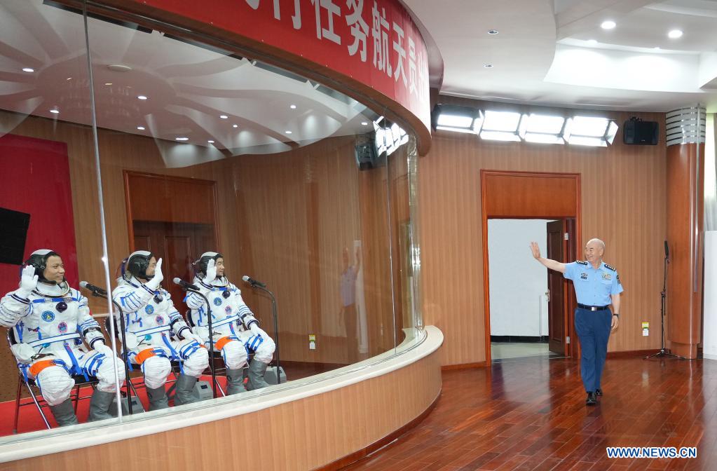 (210617) -- JIUQUAN, June 17, 2021 (Xinhua) -- Xu Qiliang, a member of the Political Bureau of the Communist Party of China (CPC) Central Committee and vice chairman of the Central Military Commission (CMC), meets with astronauts Nie Haisheng, Liu Boming and Tang Hongbo of the Shenzhou-12 mission ahead of the launch at the Jiuquan Satellite Launch Center in northwest China, June 17, 2021. The crewed Shenzhou-12 spaceship, launched from the Jiuquan Satellite Launch Center in northwest China at 9:22 a.m. (Beijing Time), successfully docked with the space station core module Tianhe at 3:54 p.m., forming a three-module complex with the cargo craft Tianzhou-2. On behalf of the CPC Central Committee, the State Council, the CMC, and General Secretary of the CPC Central Committee Xi Jinping, Xu saw them off at the launch center. (Xinhua/Li Gang)