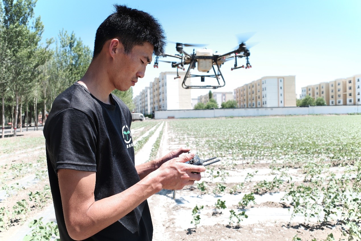 Hu Xinliang, a drone operator, pilots his drone to spray insecticide in the cotton fields of Shihezi, northwestern China's Xinjiang Uygur Autonomous Region, June 1, 2021. (People's Daily Online/Kou Jie)